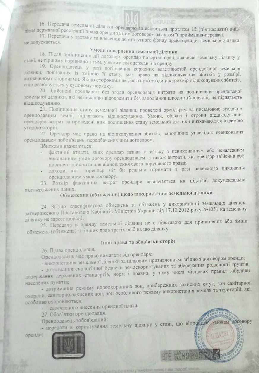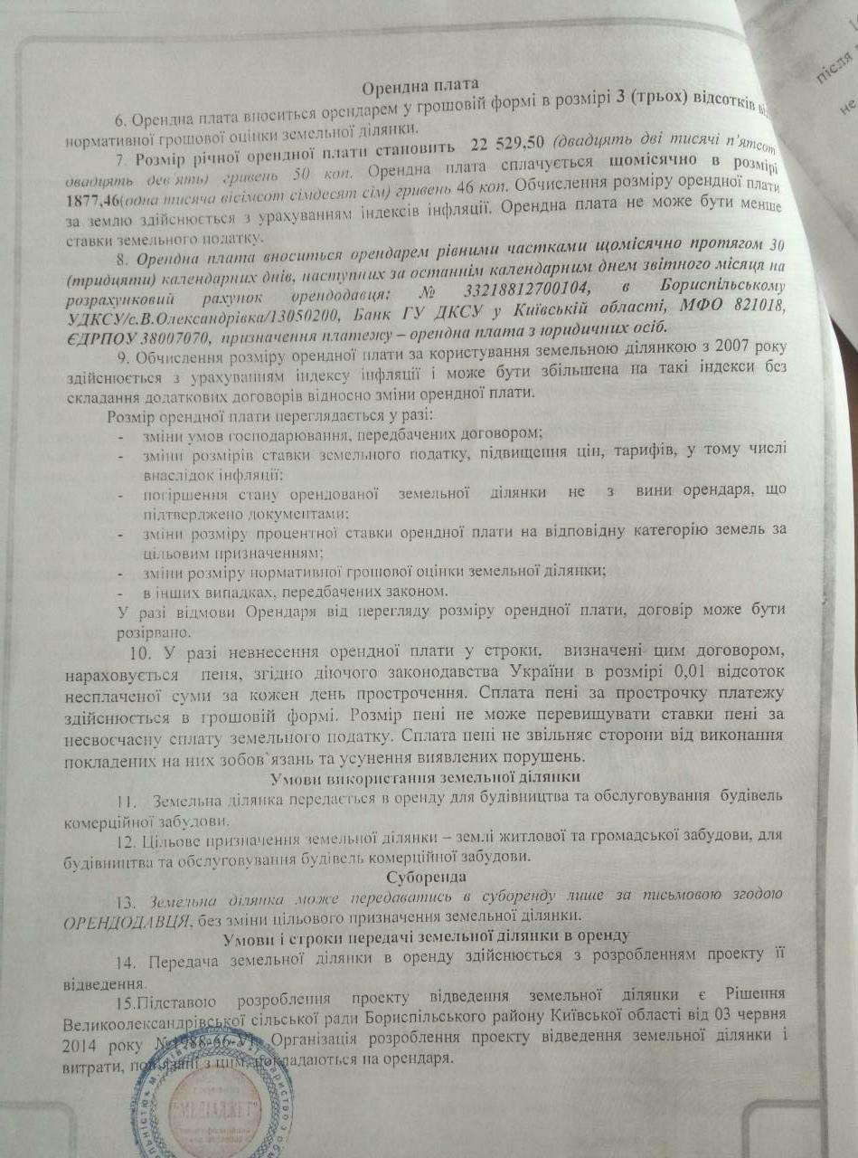 Таке збільшення нормативної грошової оцінки призвело до внесення змін до договору оренди земельної ділянки. І у липні 2016 року Великоолександрівська сільська рада ініціює внесення змін до договору оренди відповідно до нової оцінки вартості землі. Змінами до договору розмір річної орендної плати збільшився і становив 76 739,10 грн, а щомісячна орендна плата – 6 394,93 грн.