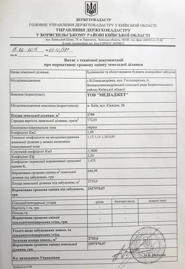 До заяви з проханням передати земельну ділянку з кадастровим номером 3220880900:08:006:0235 у власність ТОВ «Медіаджет» компанія додає витяг із технічної документації про нормативну грошову оцінку земельної ділянки, яка перебуває в оренді у ТОВ «Медіаджет».