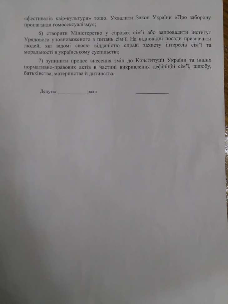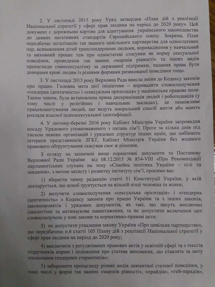 "Сьогодні є безліч викликів, які впливають на стан людей і сімей в Україні: сирітство, діти-інваліди, діти з особливими потребами, матері-одиначки, неповні сім’ї, неможливість повноцінно реалізувати свої конституційні права на лікування, навчання, житло, соціальний захист, гідний життєвий рівень. Разом з тим з незрозумілих причин держава надає пріоритетну увагу лише штучно створеній проблемі так званої дискримінації людей з нетрадиційною сексуальною орієнтацією", – йдеться в документі.