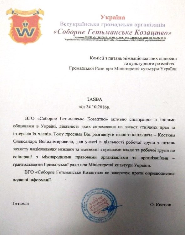 Як вдалось встановити, у 2016 році «кремлівський стратег» М. Ямненко виписує рекомендаційного листа на ВГО «Соборне Гетьманське Козацтво» в особі Гетьмана Костюка Олександра Володимировича для участі у діяльності робочих груп Комісії з питань міжнаціональних відносин та культурного розмаїття Громадської ради при Міністерстві культури України.