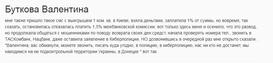 Позвонив по указанному телефону, мужчина услышал приятный вежливый голос, который сообщил ему о том, что он действительно выиграл однокомнатную квартиру в элитном доме Киева. Если условия розыгрыша, указанные на сайте «Стройбуд», его устраивают, он может получить выигранную недвижимость. Однако сначала нужно заплатить 800 гривен за предоставление информации из Государственного реестра прав на недвижимое имущество и оплатить административный сбор в размере 1% процент от стоимости недвижимости. И сделать это нужно в течение суток, иначе выигрыш уйдет к другому счастливчику.