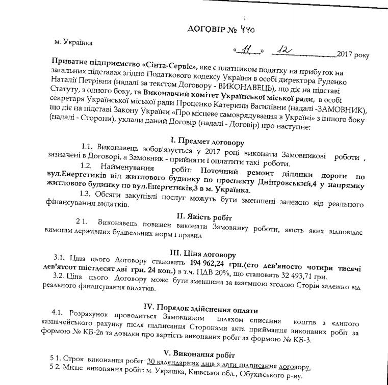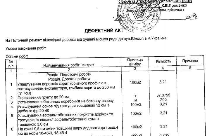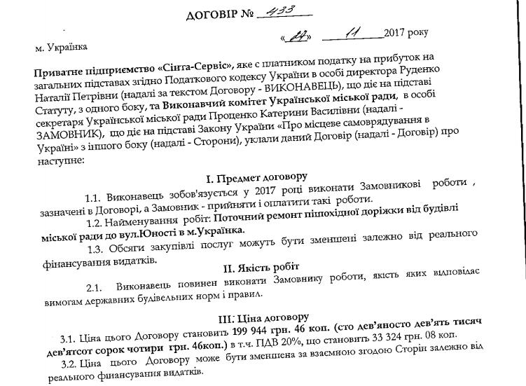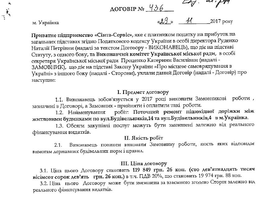 На тому ж тижні виконком Українки уклав ще один договір на ремонт пішохідної доріжки в іншому місці – від будівлі міської ради до вул.Юності в м. Українка вартістю 199 944,46 грн. Виконавець – той самий.