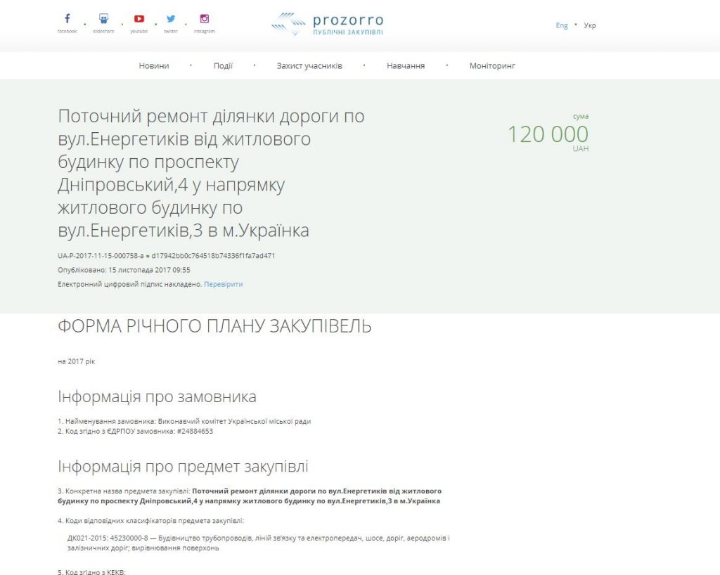 Перед виходом матеріалу міськрада міста Українка оприлюднила на сайті ProZorro ще один договір на ремонт дороги: «Поточний ремонт ділянки дороги по вул.Енергетиків від житлового будинку по проспекту Дніпровський,4 у напрямку житлового будинку по вул.Енергетиків,3 в м.Українка».