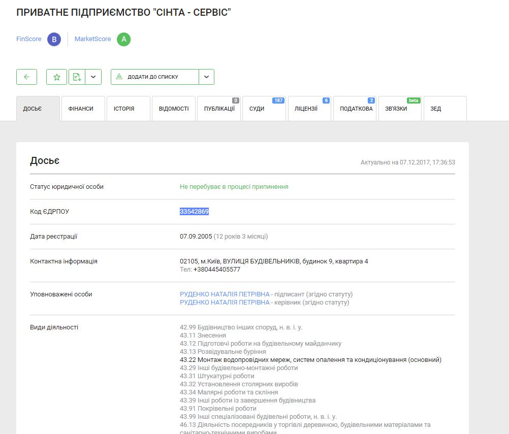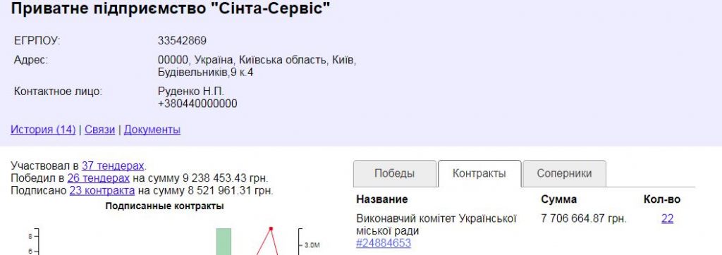 Договір укладено з приватним підприємством "Сінта-Сервіс". Згідно з даними аналітичної системи youcontrol, основним видом діяльності компанії є монтаж водопровідних мереж, систем опалення та кондиціонування.