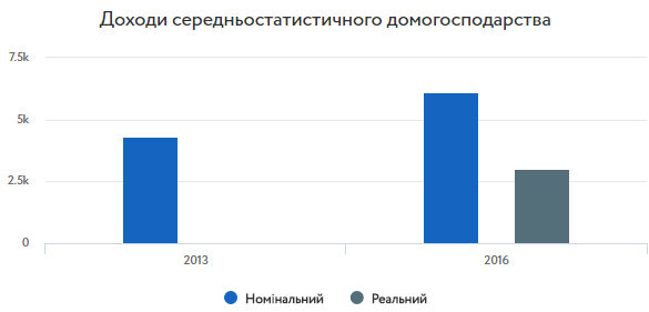 В 2013 году общие доходы среднестатистического домохозяйства cоставили 4331 грн в месяц, а в 2016 — 6095 грн. Номинальный рост составляет 29%, но с учетом инфляции (202%) средние доходы уменьшились в 1,4 раза.