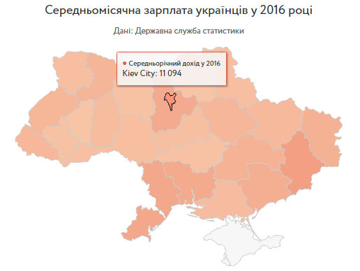 Номинальная зарплата росла каждый год, но из-за двукратной инфляции реальная зарплата лишь вернулась к уровню 2013 года в Киеве и Закарпатской области, а в других областях уровень оплаты труда был существенно меньше. В среднем по Украине реальная зарплата была в 2016-м на 11% меньше по сравнению с 2013-м. В прошлом году зарплаты хуже «восстановились» после кризиса в Луганской (-19% от дохода 2013 года), Днепропетровской (-18%) и Кировоградской (-17%) областях.