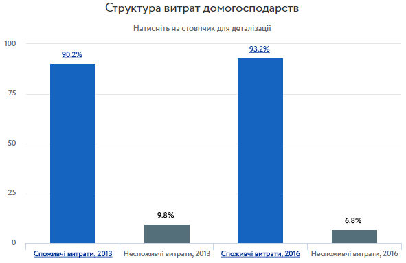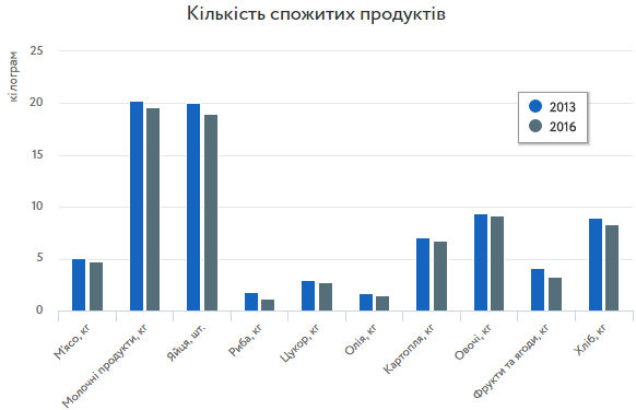 За четыре года украинские домохозяйства сократили непотребительские расходы — на 3% (до 6,8%). Соответственно, все остальное — потребительские расходы, которые в 2016 году составили 93,2%. Доля основной статьи расходов — продукты питания — почти не изменилась. В 2016 году она составила 49,8%, однако количество продуктов в килограммах, которые купили украинцы, уменьшилось.