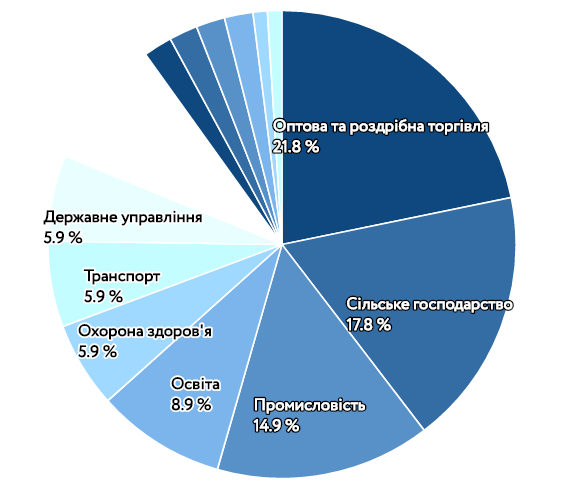 Если анализировать занятое население в разрезе секторов экономики, то изменений почти не произошло. Наибольшее количество украинцев работает в торговле (21% от общего количества занятых), сельском хозяйстве (17%) и промышленности (15%).