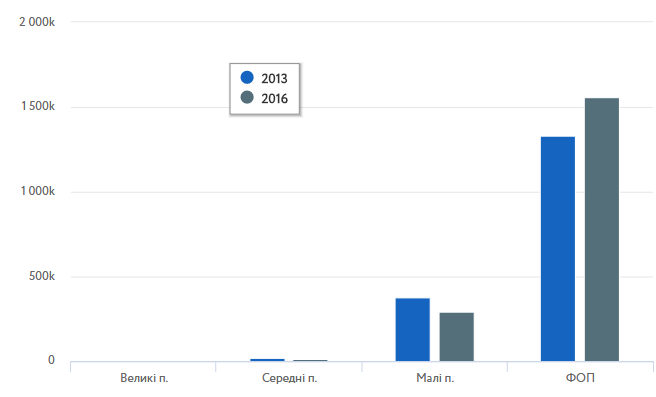 В 2013 году официально было зарегистрировано 1,72 млн субъектов хозяйствования (без учета зоны АТО и Крыма). За последние три года наблюдается падение количества большого (на 41%), среднего (21%) и малого (22%) бизнеса. Причиной может быть то, что многие компании закрылись или для уменьшения налогообложения перешли на более выгодные условия «ведения бизнеса». По состоянию на 2016 год в Украине насчитывалось 1,86 млн субъектов хозяйствования.