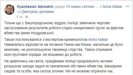 "Только что в Вышгородском отдела полиции закончили очередное заслушивание результатов работы следственно-оперативной группы по факту убийства Ирины Ноздровской", - написал он.