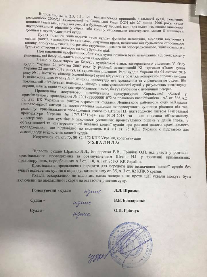 В состав коллегии судей, которые взяли самоотвод, входили: Виталий Бондаренко, Людмила Шрамко и Александра Гринчук.