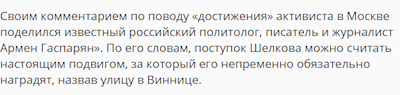 Позже российский политолог Армен Гаспарян назвал Шелкова украинцем, добавив, что его поступок можно считать "настоящим подвигом".