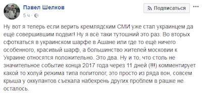 "Ну вот я теперь если верить кремлядским СМИ уже стал украинцем, да еще совершившим подвиг! Ну я, все-таки, тутошний, это раз. Во-вторых, сфоткаться в украинском шарфе в "Ашане" или где-то еще ничего особенного, красивый шарф, а большинство жителей московии к Украине относятся положительно", - ответил он Гаспаряну.