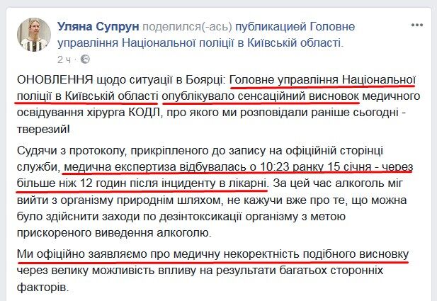 Однако позднее министр здравоохранения Ульяна Супрун жестко высказалась в Facebook по поводу утверждения полиции о том, что "хирург был трезв".