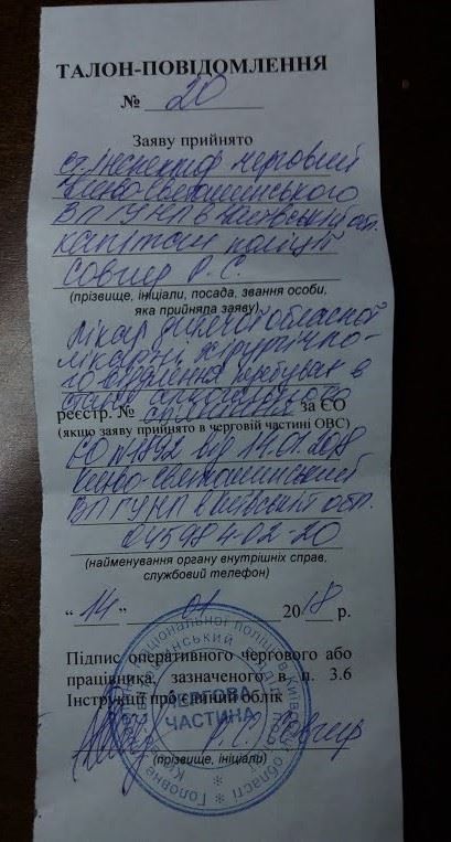 В итоге отец девочки поехал в отделение полиции и написал заявление, а полицейские, с его слов, составили протокол (ниже фото "корешка").