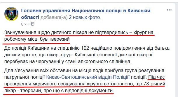 "Обвинения касательно детского врача не подтвердились – хирург на рабочем месте был трезвый, о чем есть соответствующие документы", – безапелляционно написали правоохранители.