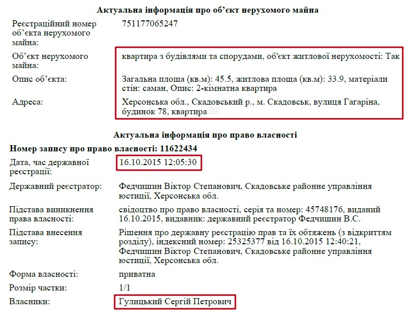 Як нам вдалось з’ясувати, подарована квартира до цього належала його батьку. Вона була приватизована ним ще у 2006 році. Але у декларації прокурора за 2014 рік вона відсутня. Серед задекларованих автомобілів у власності Сергія Гулицького — Acura MDX 2008 року, вказаною вартістю 208 тис. грн.