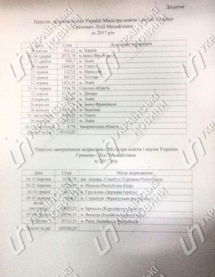 Кроме того, Гриневич была в 3 командировках (Великобритания, Израиль и Франция), финансирование которых осуществлялось за счет принимающей стороны либо секретариата Кабинета Министров.