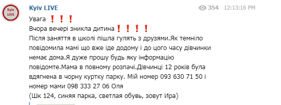 "Вчера вечером пропал ребенок. После занятия в школе пошла гулять с друзьями. Как стемнело, сообщила маме, что уже идет домой и до этого момента девочки нет дома. Я очень прошу любую информацию сообщите. Мама в полном отчаянии", – сказано в сообщении.