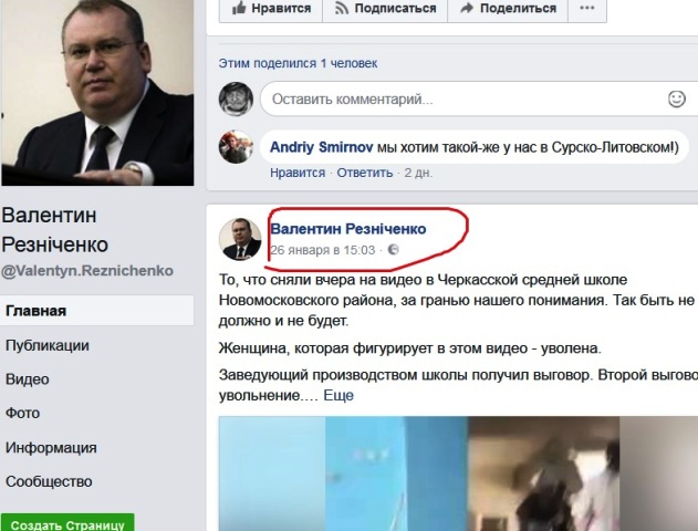 Обращают на себя внимание два момента. Во-первых, именно со страницы Валентина Резниченко видео разлетается по всей стране – почти две тысячи перепечаток и 25 тысяч просмотров. При этом вся прочая лента главы области, что вполне объяснимо, посвящена исключительно позитиву – реальным достижениям областной госадминистрации. И вдруг такой откровенный негатив, показывающий Днепропетровщину с другой стороны, выводящий регион в центр всеукраинского скандала.