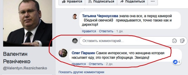 Буквально вторым по счету, через несколько минут после публикации видео губернатором, этот пост комментирует некто Олег Паршин. Судя по всему, он житель Черкасского, так как уверенно заявляет, что «героиня» скандального видео – не повар, а уборщица пищеблока. Чтобы знать такие детали, нужно жить в поселке и знать в лицо его жителей.