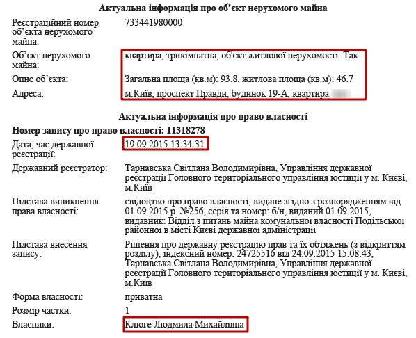 Согласно реестра имущественных прав, с 2015 года в собственности жены прокурора находится жилье площадью 93 кв. м. по адресу проспект Правды, 19-А. Впрочем, стоимость этой квартиры Людмила Михайловна не запомнила. Интересно, что в декларации Людмилы Михайловны указано, что ее дети и муж получили право на пользование этой квартирой еще в 2008 году. Это подтверждает и ее декларация за 2013 год, где указано, что она является собственником квартиры площадью 93,8 кв. м. (только в декларации указана площадь 92,8 кв. м., что больше похоже на ошибку). Вот только этой квартиры нет в декларации прокурора Александра Геннадиевича за аналогичный 2013 год.