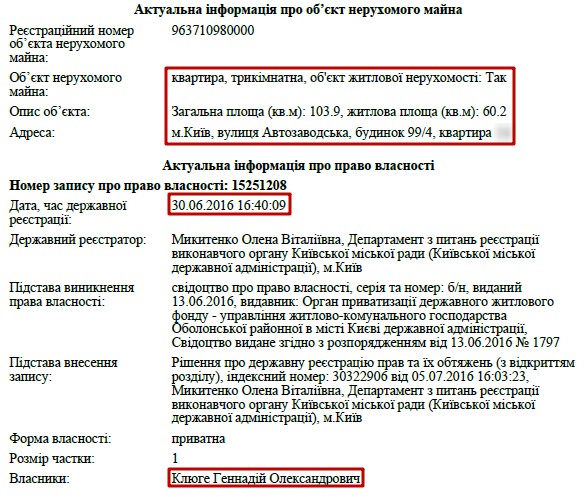 Отец Александра Геннадиевича, экс-первый заместитель прокурора Киевской области - Геннадий Александрович Клюге тоже имеет жилье в столице. В 2016 году он приобрел квартиру площадью 103 кв. м. по адресу ул. Автозаводская, 99/4. Подобная квартира в этом доме стоит более 120 тыс. долларов. Поэтому, если учесть эту стоимость и сумму, которую Геннадий Александрович занял своему сыну, возникает логичный вопрос - откуда у человека, который всю жизнь работал в органах прокуратуры, такое состояние?!