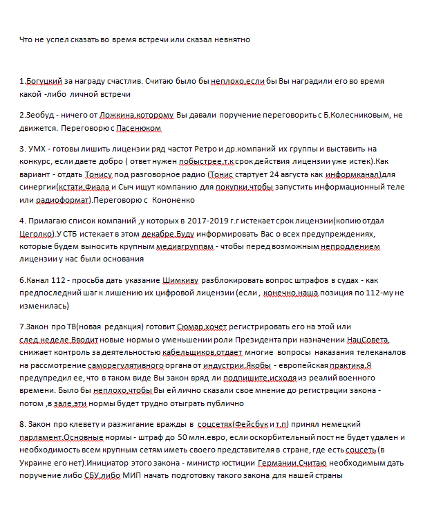 Планирует говорить с президентом от отжиме вещателя “Зеонбуд” в пользу Ахметова. Поручение это, судя по тексту, исходит от самого Порошенко: “ничего от Ложкина, которому Вы давали поручение переговорить с Б.Колесниковым, не движется. Переговорю с Пасенюком”. Обратите внимание, что и здесь всплывает фамилия банкира президента Макара Пасенюка, который засветился в скандале со 112 каналом.