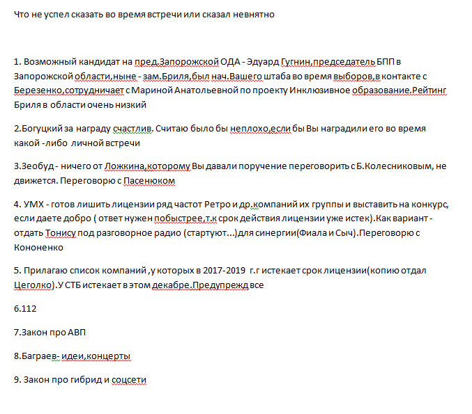 Публикуем черновик плана, который Артеменко подготовил себе для разговора с Порошенко в июле 17 года.