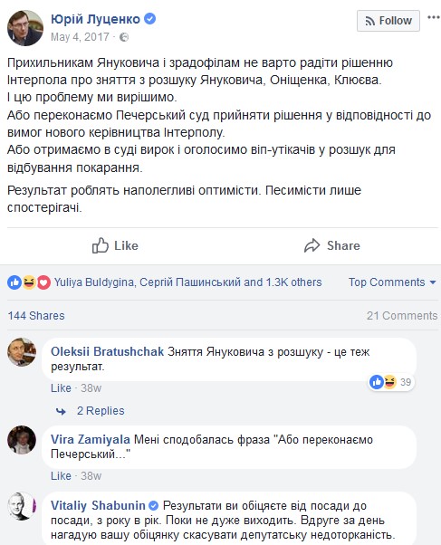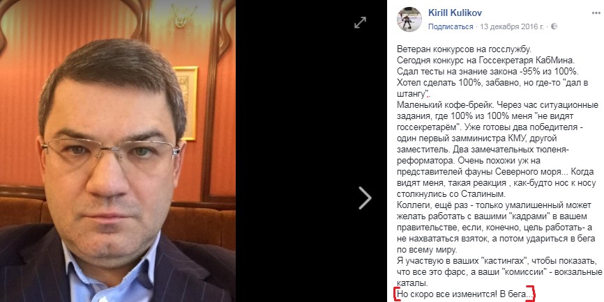 На фото – Экс-глава украинского бюро Интерпола Кирилл Куликов в Фейсбуке. В 2016ом году он внезапно активизировался, и уже «прописан» в качестве эксперта по всем вопросам на нескольких украинских телеканалах. Не Луценко ли его продвигает?