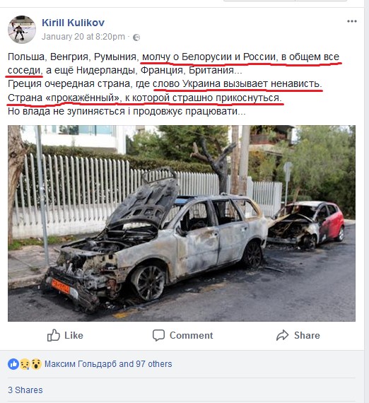 На фото – Так Кирилл Куликов прокомментировал атаку на посольство Украины в Греции радикалов с коктейлями Молотова. Это случилось сразу после того как ВР признала Россию агрессором.