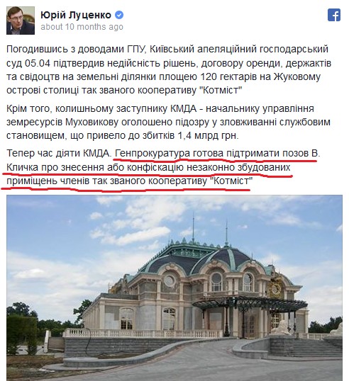 На фото – Луценко не так давно тоже опубликовал фото Межигорья Юрия Иванющенко и пригрозил конфискацией. Но взвалил эту задачу на мэра Киева Виталия Кличко.