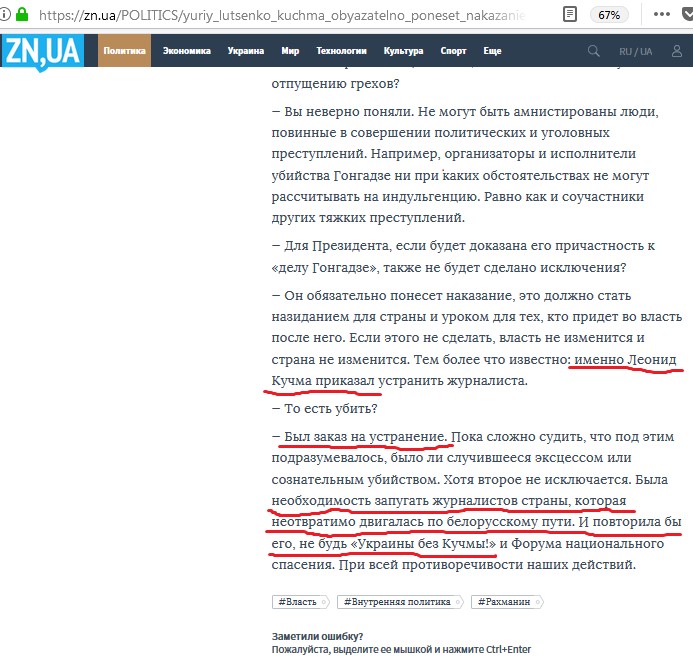 На фото – знаменитое интервью Луценко, где он объявляет заказчиком Кучму и указывает на мотив: запугивание журналистов страны, «которая двигалась по белорусскому пути».