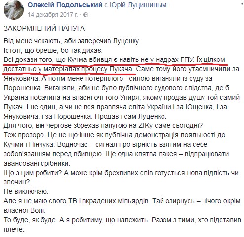 Теперь уже Луценко выступает в роли адвоката Кучмы. Оказывается, Пукач не дает показаний, да и вообще не здоров (а Пукач заявлял о давлении, которое на него оказывают в прокуратуре относительно показаний о заказчиках). И тайные записи майора, обнародование которых стало звездным часом самого Луценко, не являются доказательством (тут Генпрокурор цепляется за принятое нарочно под Кучму решение Конституционного суда).