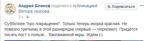 Так, журналист Андрей Блинов прокомментировал публикацию Уколова так: "Субботнее "про покращення". Только теперь икорка красная. Не повезло третьему в этой разнарядке (первый — Чорновил). Придется писать пост о пользе... баклажанной икры. Ждем-с)".