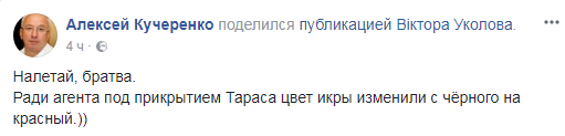 Экс-министра ЖКХ Алексея Кучеренко предлагает: "Налетай, братва. Ради агента под прикрытием Тараса цвет икры изменили с черного на красный".