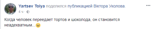 "Когда человек переедает тортов и шоколада (видимо, имеется в виду Roshen – кондитерский бизнес президента. – Ред.), он становится неадекватным", – считает пользователь Yartsev Tolya.