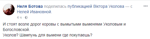 Киевлянка Неля Ботова пишет: "И стоят возле дорог коровы с вымытыми выменями Уколовым и Богословской. Уколов? Шампунь для вымени где покупаешь?"