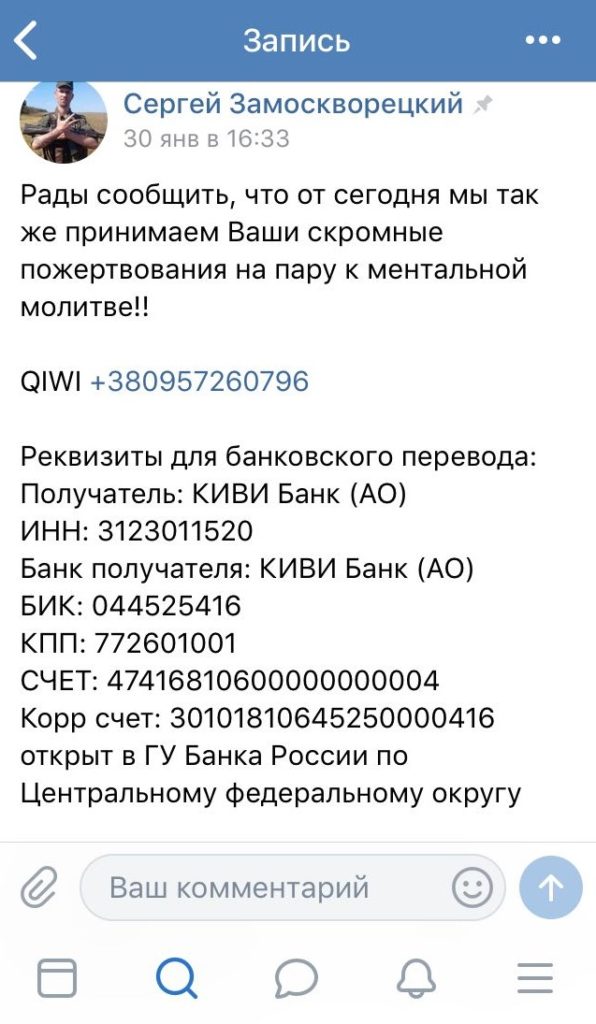 Не докладаючи значних зусиль ми встановли, що С. Замоскворецький веде особисту сторінку «ВКонтакте» (акаунт — vk.com/id454564217, закріплений за номером мобільного оператора «МТС» +38095-726-07-06), здійснює відверту антиукраїнську пропагандистську діяльність та пропонує усім надавати грошову допомогу на підтримку ополченців Донбасу у війні проти «укропів» та «хунти» із зазначенням на сторінці реквізитів гаманця «QIWI» («Реквизиты банковского перевода: Получатель: КИВИ Банк (АО); ИНН: 3123011520; Банк получателя: КИВИ Банк (АО); БИК: 044525416; КПП: 772601001; СЧЕТ: 47416810600000000004; Корр счет: 30101810645250000416 открыт в ГУ Банка России по Центральному федеральному округу; В назначении платежа обязательно указывайте: Пополнение кошелька Visa QIWI Wallet N 095-726-07-96; Телефон +380957260796»), кошти з якого, вочевидь йдуть на підтримку НЗФ «ЛНР/ДНР». Хоча вони звісно можуть і просто розкрадатися, як це водиться у молодих фейкових республіках.
