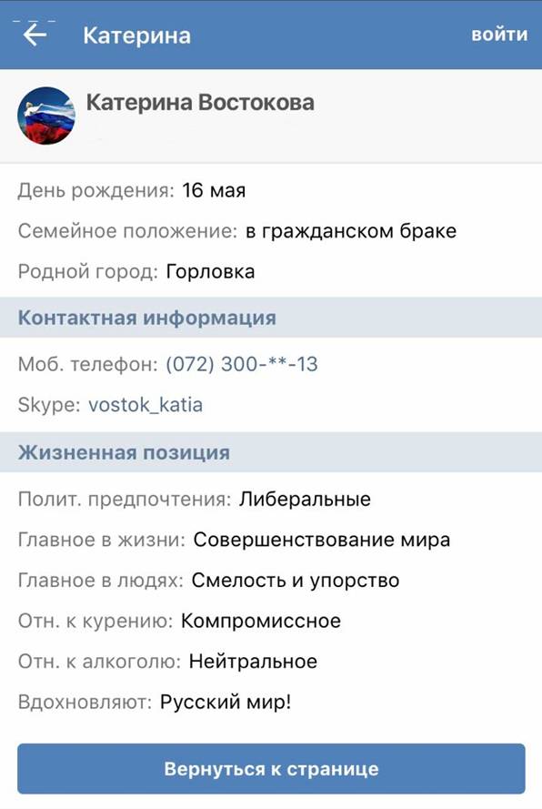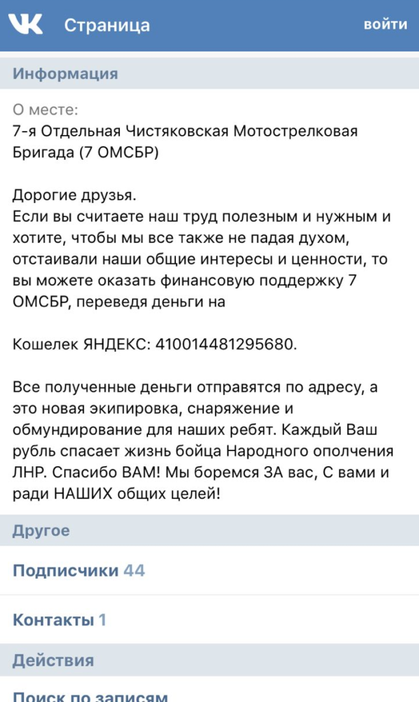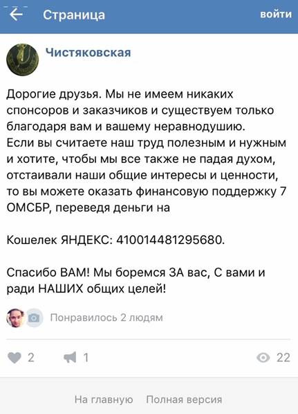 Інший бізнес-партнер «С» – Катюша Востокова є адміністратором групи «ВКонтакте» за назвою «Чистяковская» (акаунт — vk.com/chistyakovskaya7), де остання веде дуже активну пропагандистську діяльність та здійснює збір коштів (гаманець «ЯНДЕКС», рахунок 410014481295680) для закупівлі НЗФ «ЛНР/ДНР» військової екіпіровки, спорядження, зброї та боєприпасів.