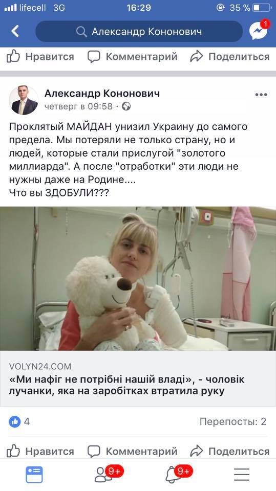 "Знакомьтесь, это Саша Кононович: лидер комсомольцев, андимайдановец, сепаратист и просто плохой человек. Запрещённая компартия, создала в Киеве организацию "антифашистский комитет Украины" и назначили Сашу главой. Сегодня они на русские рубли решили напечатать агитацию, на которой призывают бороться с "нацизмом" и изображают на них некого Вадима Папура, сепаратиста который погиб 2 мая в Одессе. Предлагаю вам ознакомиться с постами этого деятеля и посмотреть, как реагирует молодёжь из Национального Корпуса на такие вещи. Слава Нации!" — написал Филимонов.