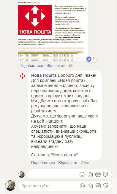 "Что касается случая, о котором сегодня появилась информация в соцсети, то база на скриншоте в посте может принадлежать любому другому украинскому предприятию, она не содержит никаких признаков того, что это данные "Новой почты", — комментирует директор по информационным технологиям компании Александр Евстратов. Он также утверждает, что обнародованная таблица содержит данные, которые отсутствуют в текущей базе "Новой почты" и в целом называет информацию в ней нерелевантной. Евстратов также добавляет, что сейчас в компании внедряется новая ИТ-программа, в которой особое внимание уделяется информационной безопасности и механизмам защиты данных.