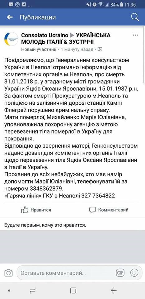 "Украинцы, кто как не мы? 31.01.2018 в Неаполе было найдено тело Оксаны Яцкив. Семья мepтвои девушки просит помощи у всех вас чтобы отправить тело в Украину, где двое маленьких детей хотят увидеть последний раз маму. Украинцы, давайте объединимся в это трудное время для семьи! Помогите", - сообщила пользователь под ником Ines Inna.