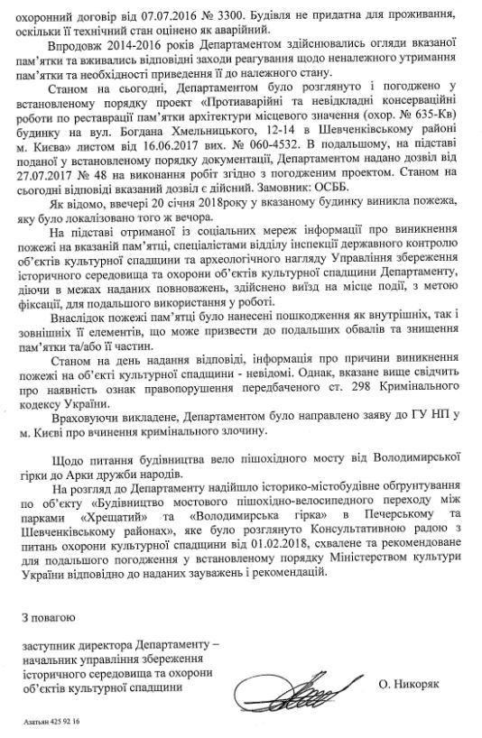 - Влітку сталася велика пожежа на верхніх поверхах пам’ятника архітектури, розташованому на розі вулиць Хрещатик і Б.Хмельницького (колишній готель «КАНЕ», 1874 р.), а 20 січня така ж велика пожежа трапилась на іншому пам’ятнику архітектури в центрі столиці - багатоповерховому будинку на вул. Б.Хмельницького, 12-14. Питання: які існують плани по реставрації (реконструкції) або знесенню цих пам’ятників? Бо Київ переповнений напівзруйнованими пам’ятниками архітектури і це його не прикрашає. Чи розглядалися варіанти проектів реставрації (реконструкції), або зносу та будівництву нових споруд на місці пам’ятників? Коли саме розглядалися чи плануються до розгляду? Чи планується обговорення проектів з професіоналами і громадою міста і коли? - Чи прийняте кінцеве рішення щодо будівництва вело-пішохідного мосту від Володимирської гірки до Арки дружби народів, над Володимирським узвозом по проекту архітектора А.Миргородського? Чи є погодження Історико-містобудівного обґрунтування Мінкультури? Чи було проведено обговорення цього проекту з професійною громадськістю і киянами? Якщо планується, то коли? |