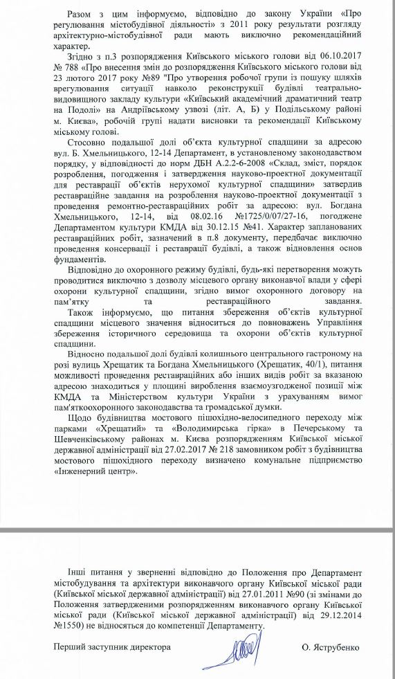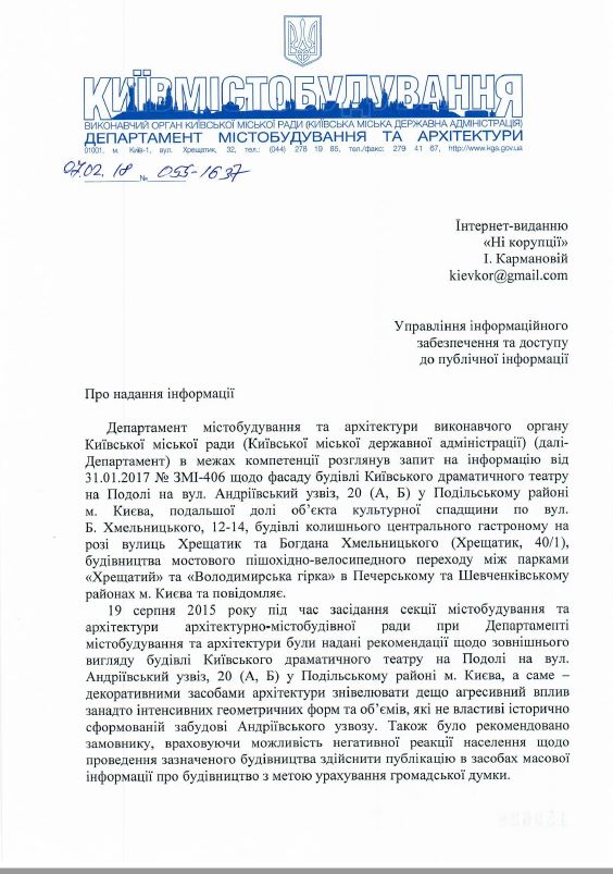 - Коли буде вирішене питання щодо зміни зовнішнього вигляду Театру на Подолі, який спотворює пам’ятку містобудування – Андріївський узвіз? Які і коли будуть проведені заходи для цього? Майже рік створена міським головою В.Кличком Робоча група працювала над «Висновками, пропозиціями та рекомендаціями...». Вони були передані В.Кличку 5 грудня 2017 р. і опубліковані на сайті Департаменту https://kga.gov.ua/teatr-na-podoli, але досі (пройшло майже 2 місяці!) реакції Департаменту містобудування та архітектури на цю працю немає. Між тим, у тому, що трапилось, є велика вина саме Департаменту, який не слідкував за проходженням проектної документації (повторного розгляду містобудівною радою проекту архітектора Дроздова не було) і схоже, що і саме будівництво відбувалося безконтрольно. Суспільство дуже занепокоєне байдужістю київської влади до вирішення цього питання. http://nikorupciji.org/2017/12/28/teatr-na-andreevskom-spuske-rabochaya-hruppa-podvela-ytohy/