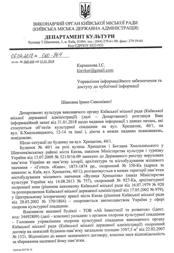 Я решила провести эксперимент – послать информационный запрос в Департамент градостроительства и архитектуры о судьбе Театра на Подоле, о планах по поводу горевших недавно в центре Киева памятников архитектуры: доме, бывшей гостинице «КАНЭ» на углу улиц Крещатика и Б.Хмельницкого (киевляне подозревают, что его снесут и построят высотку, подобную Универмагу), и бывшего доходного дома на ул. Б.Хмельницкого, 12-14 (тоже есть проект высотной застройки). Тогда я еще не знала, что 8 февраля будет гореть и дом на ул. Владимирской, 20/21, напротив Колокольни Софийского собора. Для этого места также есть проект высокого массивного здания. Еще меня интересовал вопрос согласования проекта вело-пешеходного моста над Владимирским спуском (стройка незаконна – это место связано с Крещением Руси и охраняется законом! Весь ландшафт Киевских гор является охраняемой законом территорией). Ниже приведен текст запроса. Запрос по этим объектам писала потому, что все они являются «больными», раздражающими точками для киевлян.