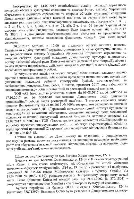 Департамент сообщает, что в феврале 2016г. утвердил реставрационное задание на разработку научно-проектной документации на проведение ремонтно-реставрационных работ на доме по ул. Б.Хмельницкого, 12-14, которое было согласовано Департаментом культуры в декабре 2015 г.(?!!!). В задании запланировано проведение исключительно консервации конструкций и реставрации дома, а также укрепление фундаментов. Набор слов не понятен: может быть, консервация конструкций, укрепление фундаментов как предварительные работы перед реставрацией здания. Далее идет ссылка на Департамент культуры – памятник архитектуры - это его заботы. Интересно, видит ли главный архитектор Киева, что происходит вокруг его офиса, и вообще, видит ли он исторический Киев или только ДПТ, которые являются сейчас главными «игрушками» чиновников с застройщиками?