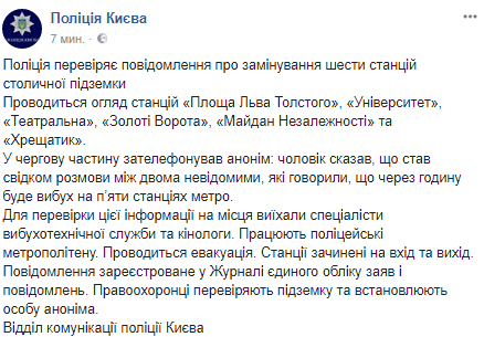 Поезда проезжают заблокированные станции. Пользователи Facebook сообщают, что не работают семь станций - станции Дворец спорта, Золотые ворота, Театральная, Университет, Крещатик.