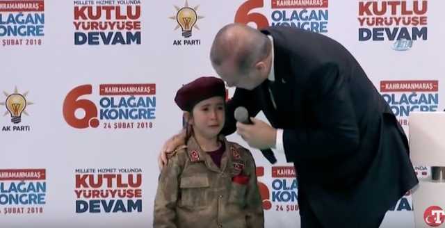 Президент Турции Реджеп Тайип Эрдоган, выступая на партийной конференции в городе Кахраманмараш, сказал шестилетней воспитаннице кадетского училища, что, если она погибнет в бою, ее похоронят с почестями. Соответствующее видео опубликовано на YouTube.