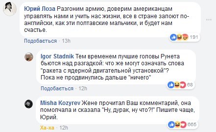 "Жене прочитал Ваш комментарий, она помолчала и сказала "Ну, дурак, ну что?!" Пишите чаще, Юрий", - написал журналист, собрав сотни лайков солидарных фолловеров.